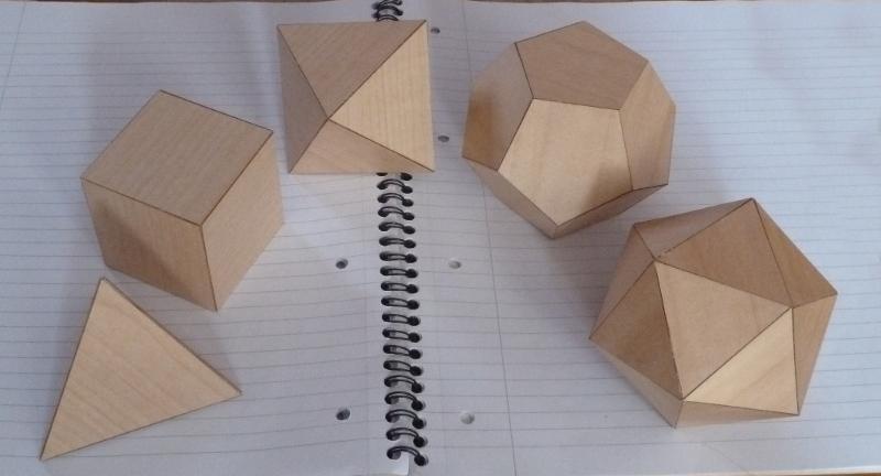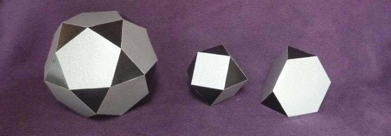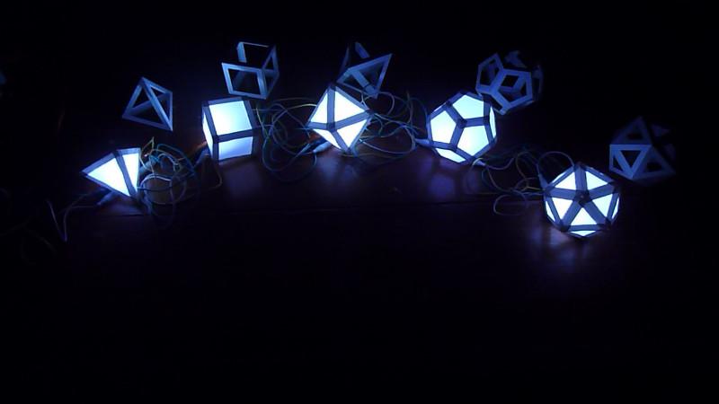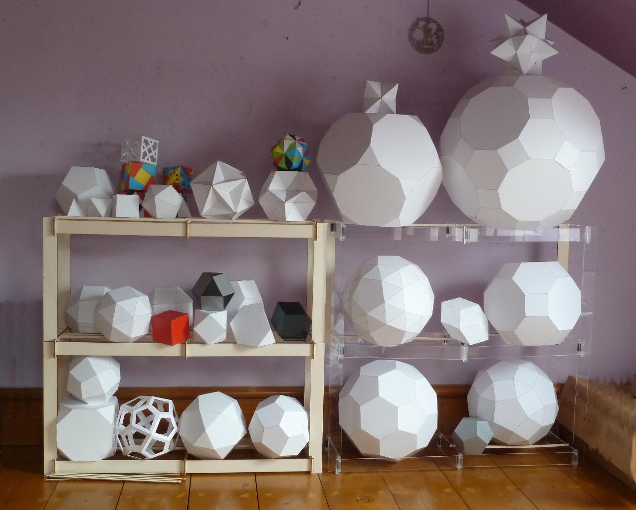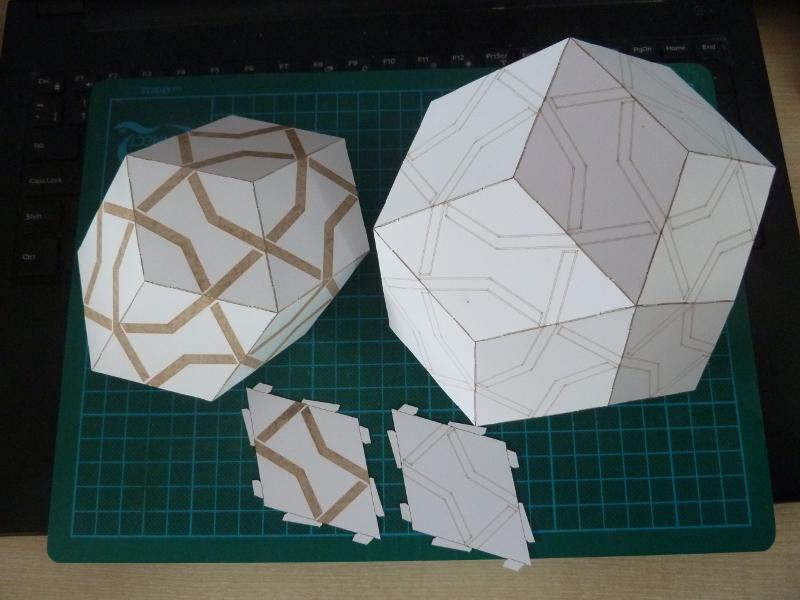 I have wanted to create wooden or other polyhedra for many years. I experimented with putting veneer on the models and having first assumed this would work on the face models, these have their joins along the edges which separate when materials are glued onto the faces. The edge models however cannot separate at the edges, they join at the vertices, and these worked well producing accurate and strong results. I made some with wood veneer and also a set with tracing paper and then inserted LED lights for a polyhedron light show.