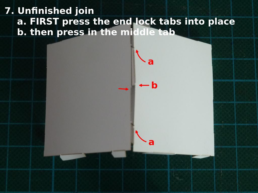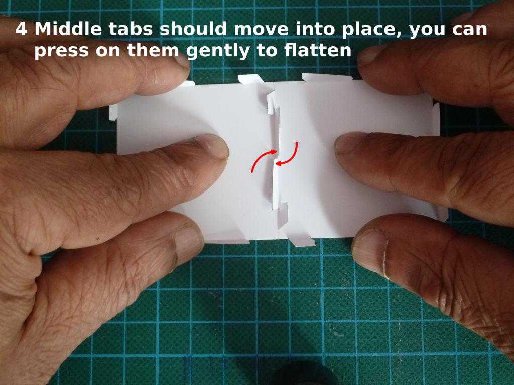 The tab design on the polygon faces has been modified slightly since the above video as many of the testers seemed to prefer a method of tucking the tabs into place rather than the slide method. The current design makes tucking in a bit easier but the slide method is still much quicker once you get used to it. Some tucking in of tabs may be useful as you get to the final faces. Try out both methods on a practice model. See below for more detailed images of the slide together method.