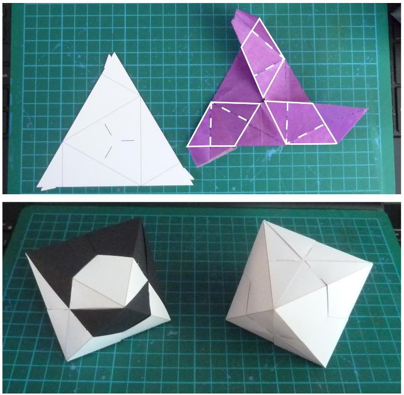 My designs have tabs at edges and vertices but unit origami designs, in this case from Tomoko Fuse, use tabs and pockets that join within the faces.