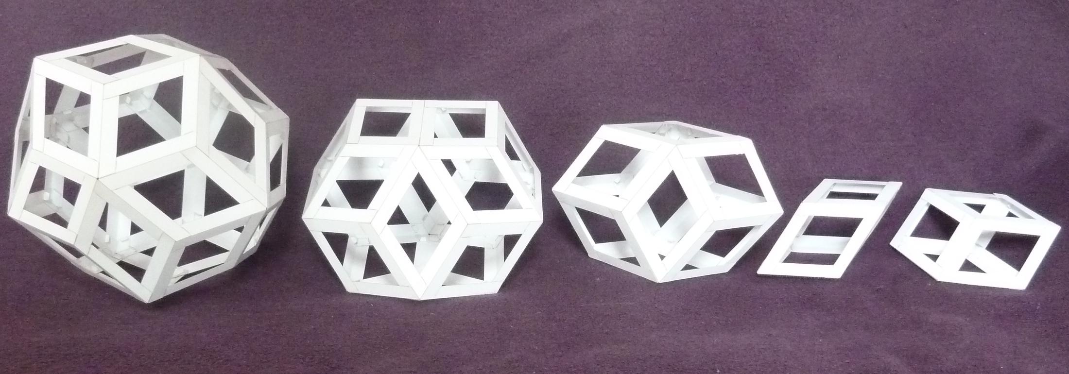 SVG files for face and edge models for the platonic set, archimedean set and rhombic set. The platonic set in 50mm edge length and 50mm circumradius versions. There are a couple of extra files for the rhombic dodecahedron (face and edge) as this pairs nicely with the Bilinski one in the rhombic set. There are also some practice files - octahedron face and edge, and rhombic parallelpiped edge. 12 of the 50mm edge golden rhombic faces should be used as practice for the rhombic parallelepiped face models.