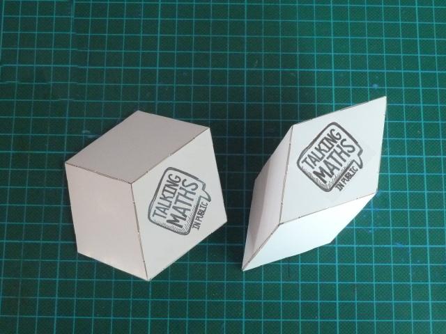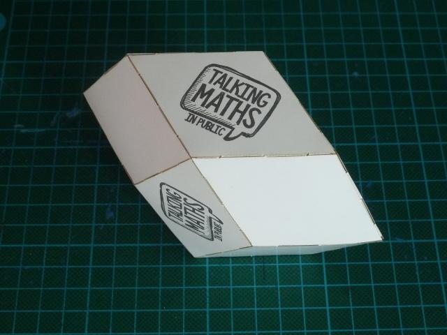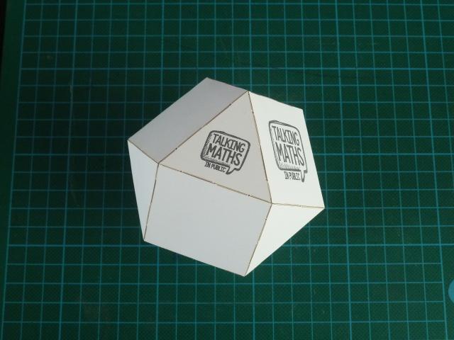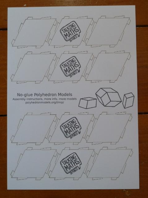 This page is for attendees of the 2021 Talking Maths in Public conference, taking place online from 25th-28th August 2021. In your conference pack you should have a sheet of polyhedron model pieces, and below you'll find more information about these and instructions on how to assemble them. Each set can be assembled into multiple different shapes, and below you can also find links to buy more sheets of pieces or instructions on how to cut your own.